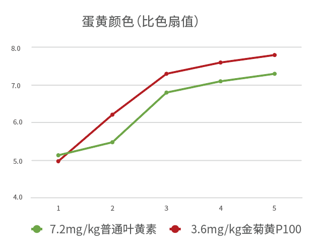 每个重复组定期采集6个鸡蛋,用比色扇测定蛋黄颜色。实验结果表明,金菊黄P100相比普通叶黄素具有更快的着色速度。