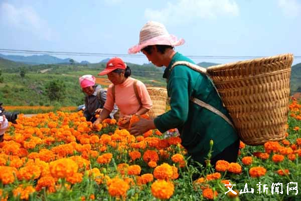 对于合作社的“贴心”服务,家住腻脚乡牛屎坡村的花农王正飞深有感触地说:“栽万寿菊我们乡的气候土壤最适合,又有合作社和立达尔公司的一条龙服务,我家2016年栽了20亩卖得7万多块钱,早就脱贫了,今年收入也跟去年差不多。”